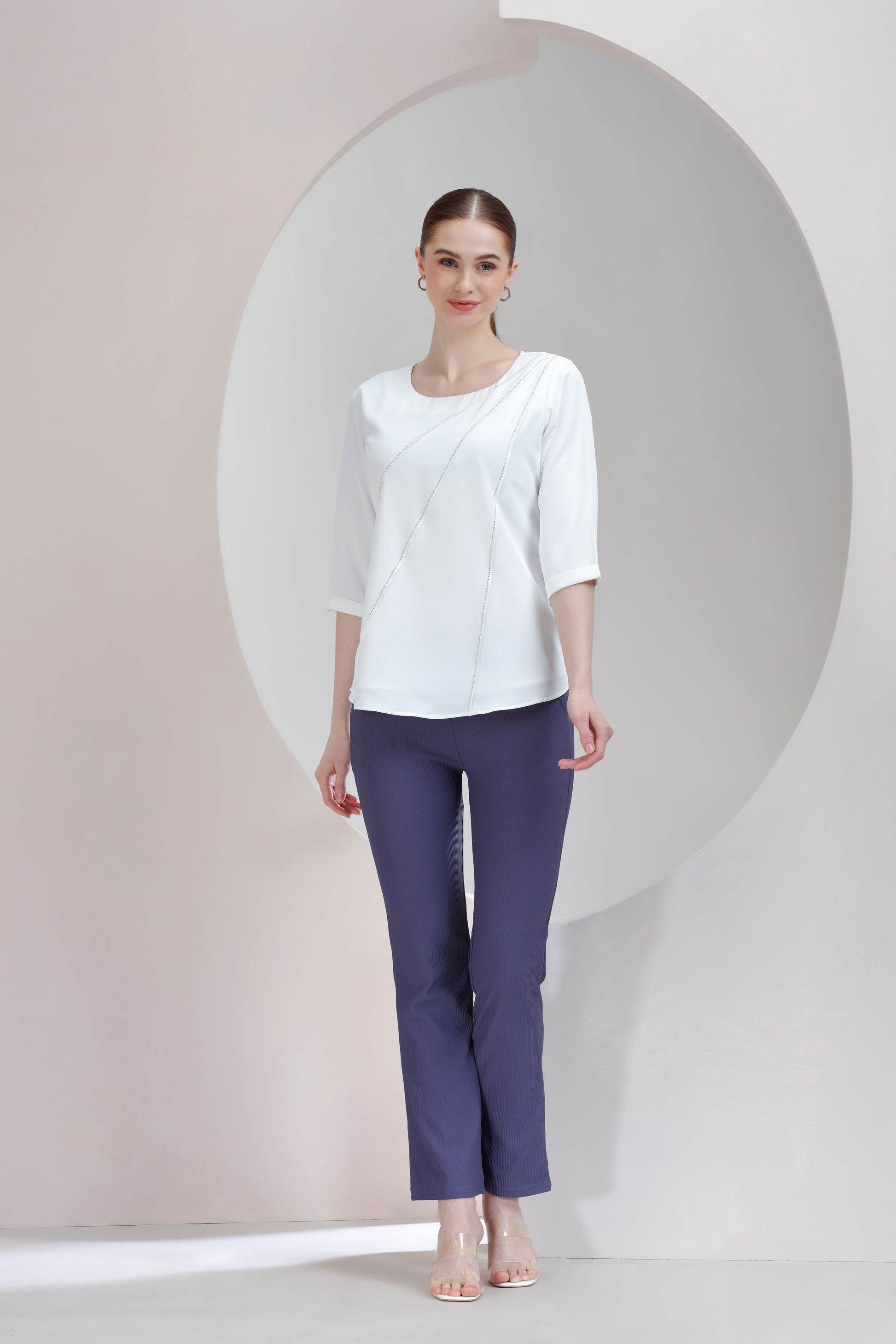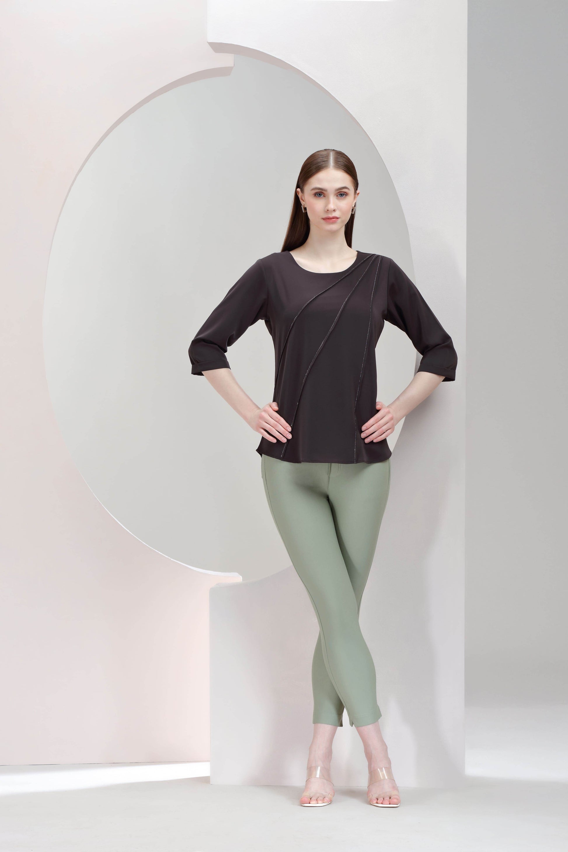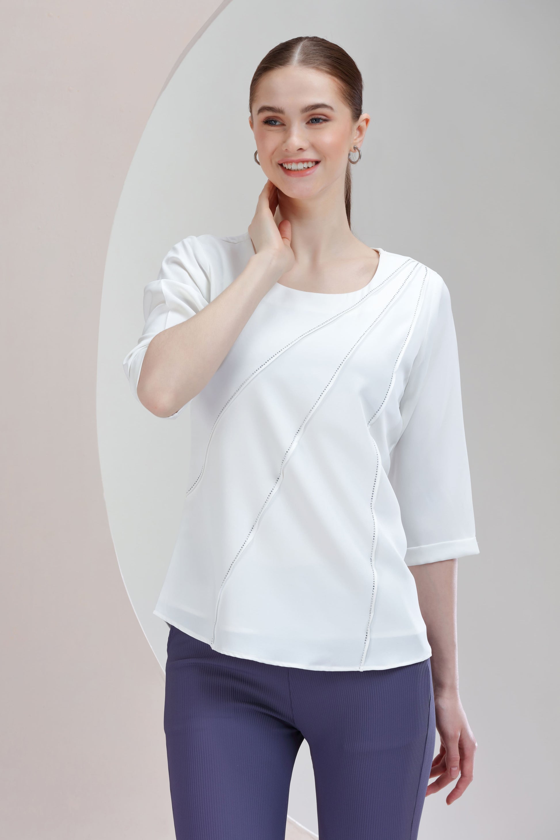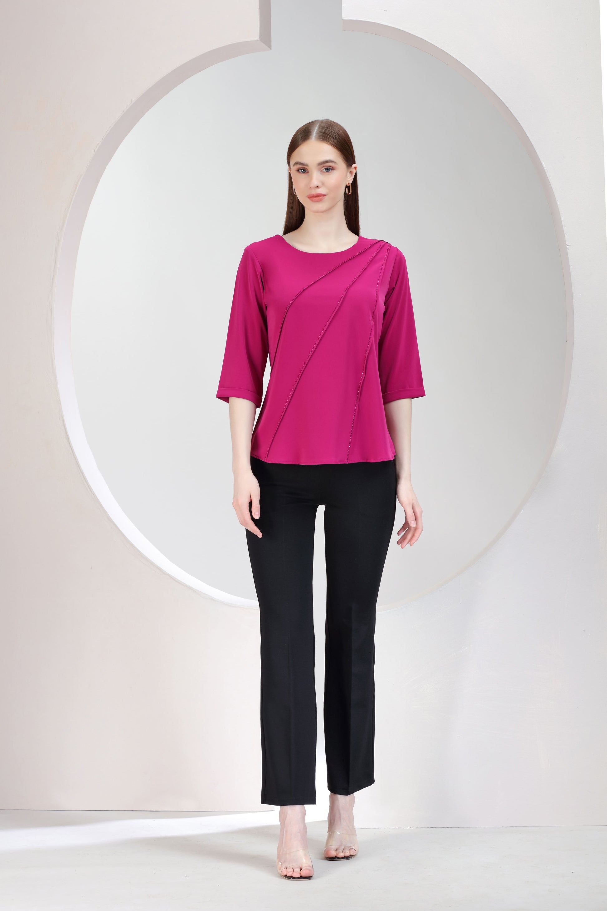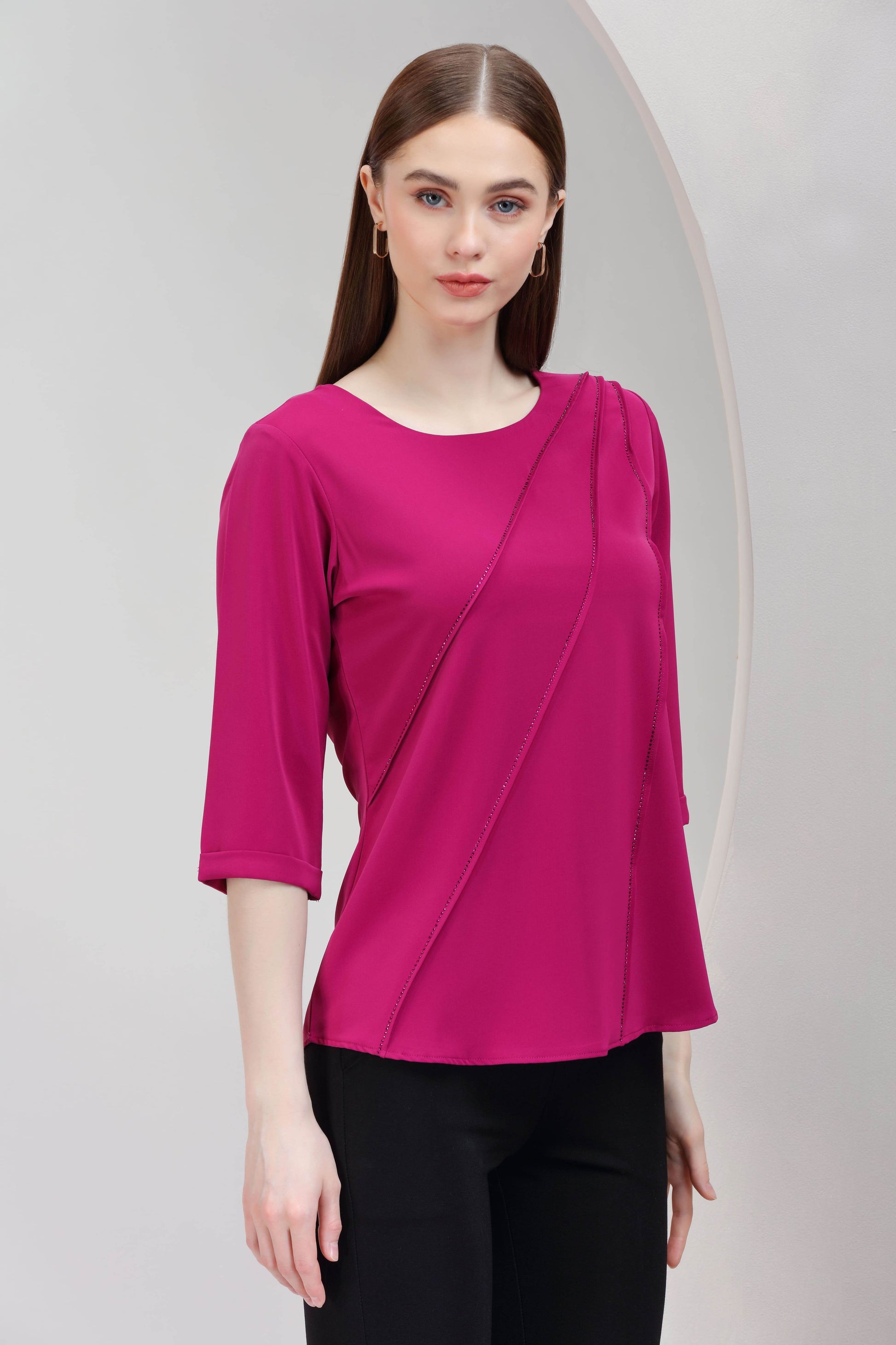 A vibrant fuchsia top adorned with delicate rhinestone embellishments along sleek diagonal panels. It blends bold color with refined sparkle, perfect for making a smart-casual statement.
