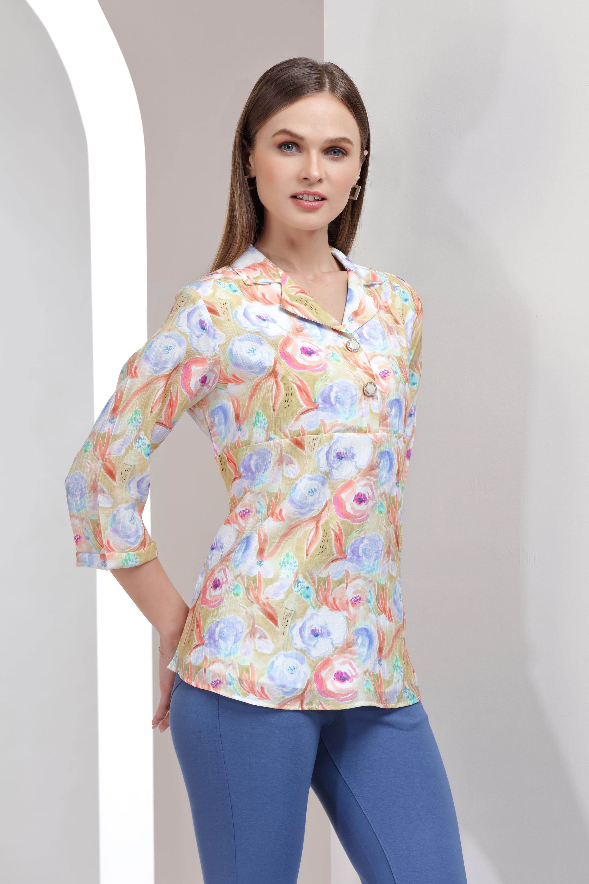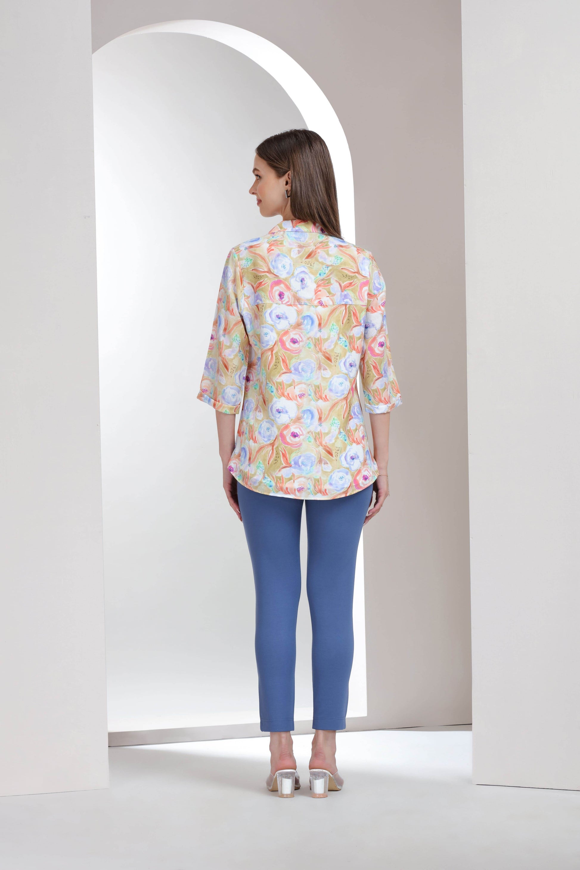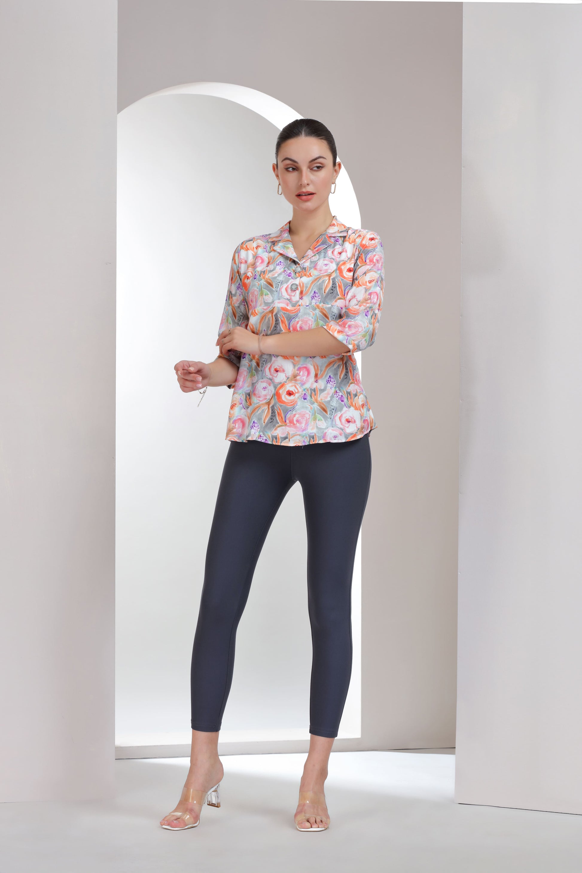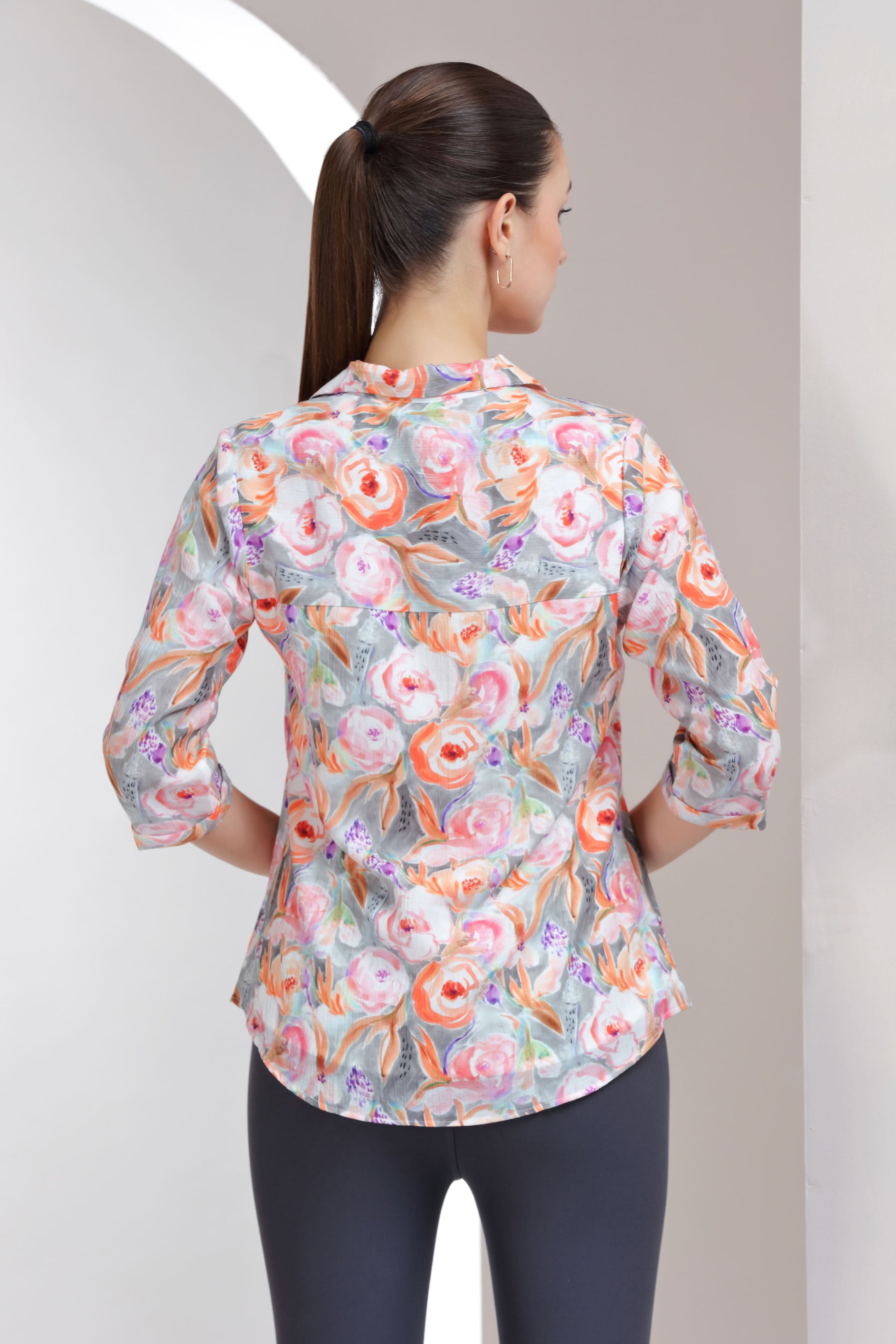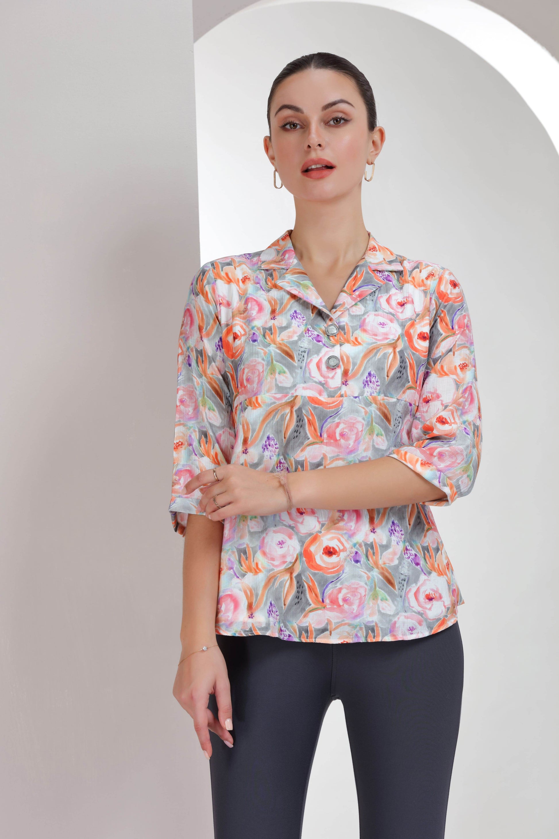 A lively floral print shirt in a medley of coral, pink, and lilac hues over a soft grey base. It pairs vibrant elegance with smart-casual comfort, making it a perfect go-to for both work and weekend brunches.